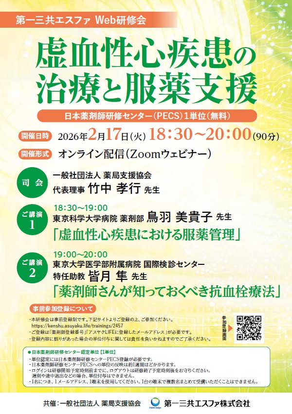 心房細動(AF)は加齢に伴って増加します。超高齢化が進む本邦においては、今後もAF患者数は増加の一途を辿ることが予測されています。AFは脳塞栓症のみならず、死亡、心不全、認知症などを増やすことでも知られるようになりました。AFの治療法には薬物治療と非薬物療法としてのカテーテルアブレーションがありますが、後者はすべてのAF患者に適用できるものではなく、仮に行ったとしても脳塞栓症予防目的での抗凝固療法の必要性を必ず吟味しなければなりません。現在、抗凝固療法の主流は、ワルファリンではなく直接作用型経口抗凝固薬(DOAC)となっています。近年、リアルワールド下でのDOACに関する臨床データが数多く出されるようになり、より実践に即したDOACの使用方法を理解できるようになりました。DOAC使用AF患者においては、安全性および有効性の両方を引き出すためのポイントとピットホールについて知っておく必要があります。治療継続のための服薬アドヒアランスの高めるDOACの選択などについても議論されるようになっています。本講演会では、薬剤師の皆さんに伝えたい心房細動に対する薬物治療と題して、特に抗凝固療法のあり方に焦点を当てながら解説いたします。